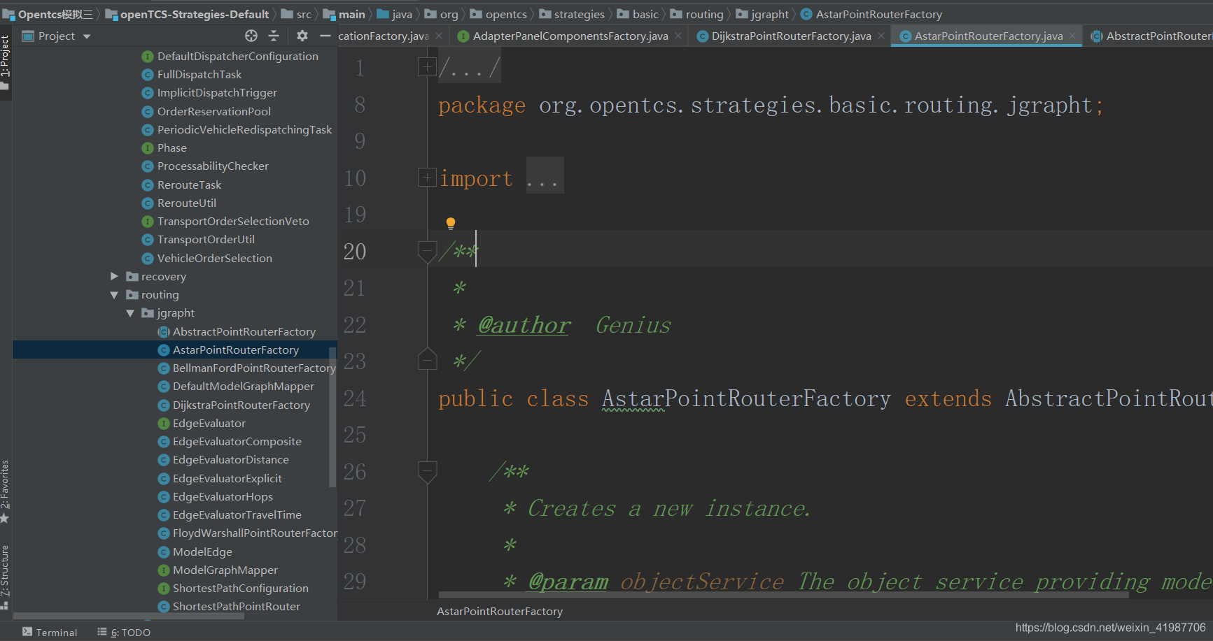 /* * Copyright (c) The openTCS Authors. * * This program is free software and subject to the MIT license. (For details, * see the licensing information (LICENSE.txt) you should have received with * this copy of the software.) */package org.opentcs.strategies.basic.routing.jgrapht;import javax.annotation.Nonnull;import javax.inject.Inject;import org.jgrapht.Graph;import org.jgrapht.alg.interfaces.AStarAdmissibleHeuristic;import org.jgrapht.alg.interfaces.ShortestPathAlgorithm;import org.jgrapht.alg.shortestpath.AStarShortestPath;import org.jgrapht.alg.shortestpath.BidirectionalDijkstraShortestPath;import org.jgrapht.alg.shortestpath.DijkstraShortestPath;import org.opentcs.components.kernel.services.TCSObjectService;/** * * @author Genius夜光 */public class AstarPointRouterFactory extends AbstractPointRouterFactory { /** * Creates a new instance. * * @param objectService The object service providing model data. * @param mapper Maps the plant model to a graph. */ @Inject public AstarPointRouterFactory(@Nonnull TCSObjectService objectService, @Nonnull ModelGraphMapper mapper) { super(objectService, mapper); } @Override protected ShortestPathAlgorithm createShortestPathAlgorithm( Graph graph) { return new DijkstraShortestPath<>(graph); // return new AStarShortestPath<>(graph); }}